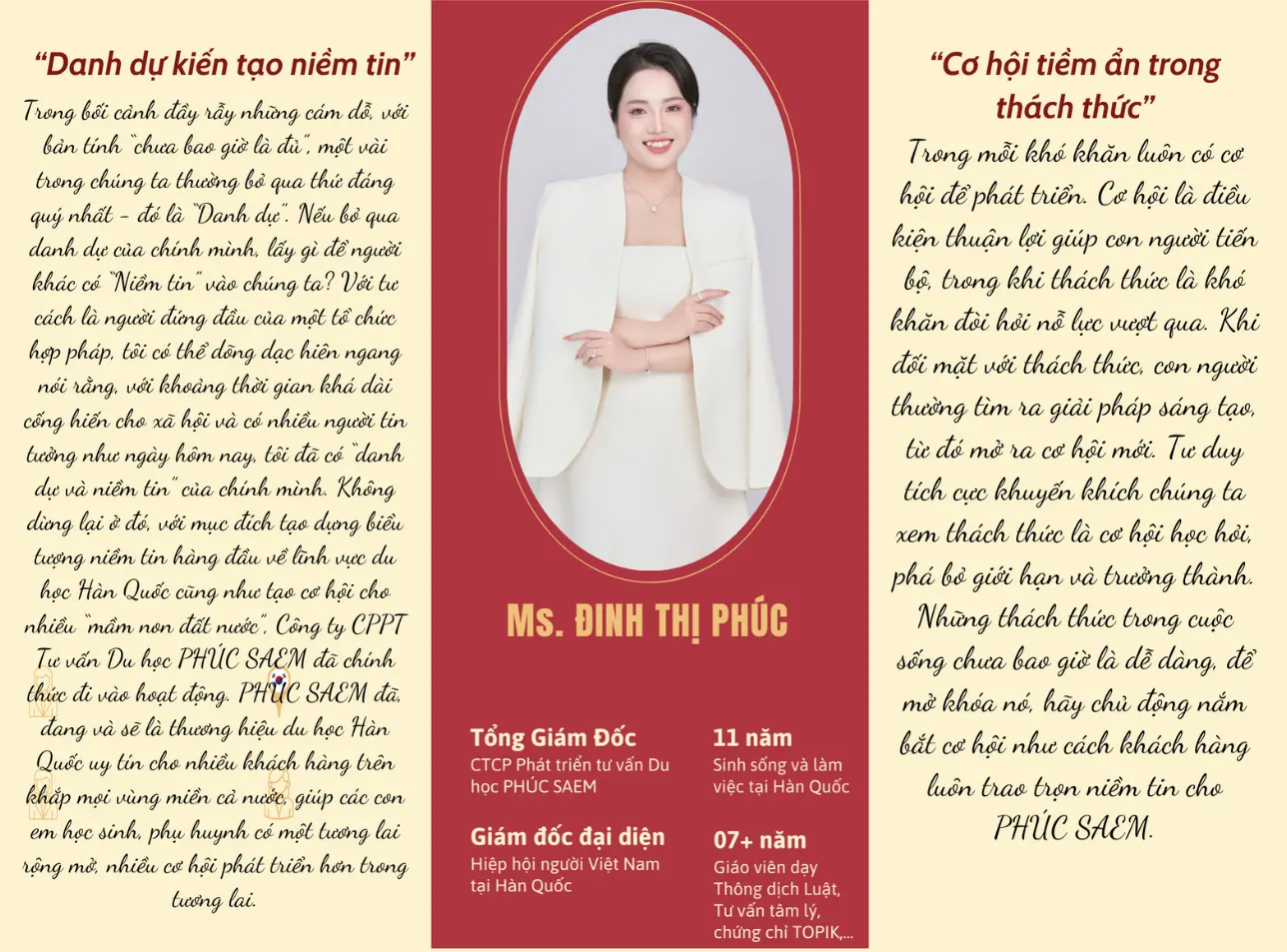 CÔNG TY CPPT TƯ VẤN DU HỌC PHÚC SAEM được thành lập với mục tiêu: “Trở thành đơn vị top đầu cả nước chuyên về du học Hàn Quốc các hệ và đào tạo tiếng Hàn & các chuyên ngành bằng tiếng Hàn” dựa trên tiêu chí “Du học dễ dàng – Chi phí tối giản – Song hành cùng bạn”.